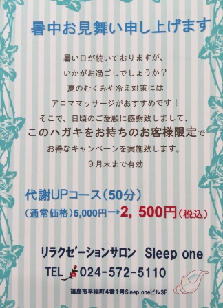 暑い日が続いておりますが、いかがお過ごしでしょうか? 夏のむくみや冷え対策にはアロママッサージがおすすめです! そこで日頃のご愛顧に感謝致しまして、暑中お見舞いハガキキャンペーン実施中です。 リピーターのお客様にはすでにハガキが届いていると思います。