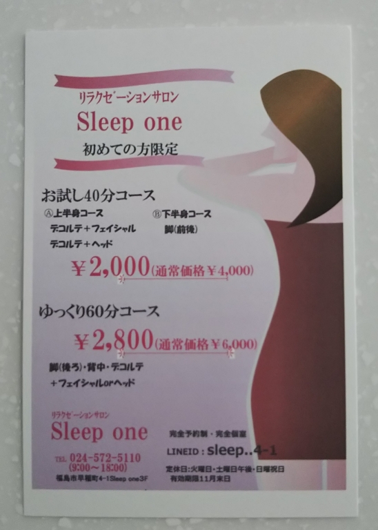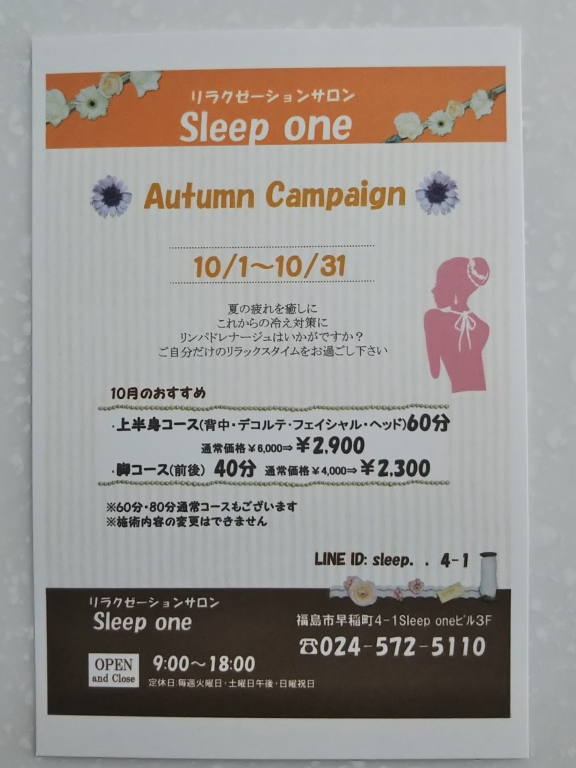 リラクゼーションサロンSleep oneでは10月のキャンペーンが始まりました! 夏の疲れをとったり、これからの冷え対策にいかがでしょうか? 初めての方限定キャンペーンもやっています(^^♪