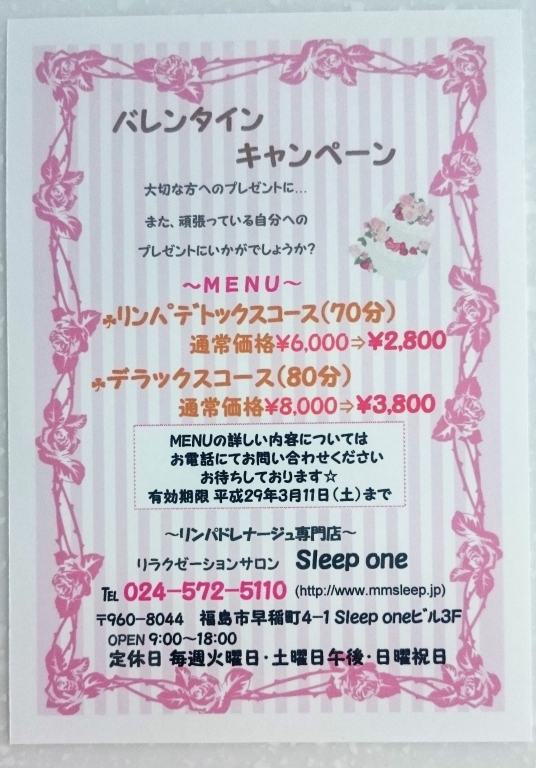 ☘リンパデトックスコース(70分)¥6,000⇒¥2,800 ☘デラックスコース(80分)¥8,000⇒¥3,800 有効期限 平成29年3月11日(土)