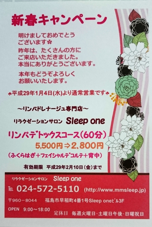新春キャンペーンが始まりました! ☘リンパデトックスコース(60分)☘¥5,500⇒¥2,800 (ふくらはぎ・背中・フェイシャルデコルテ施術) お電話のご予約で 「ホームページのハガキを見た」とお伝えください♪